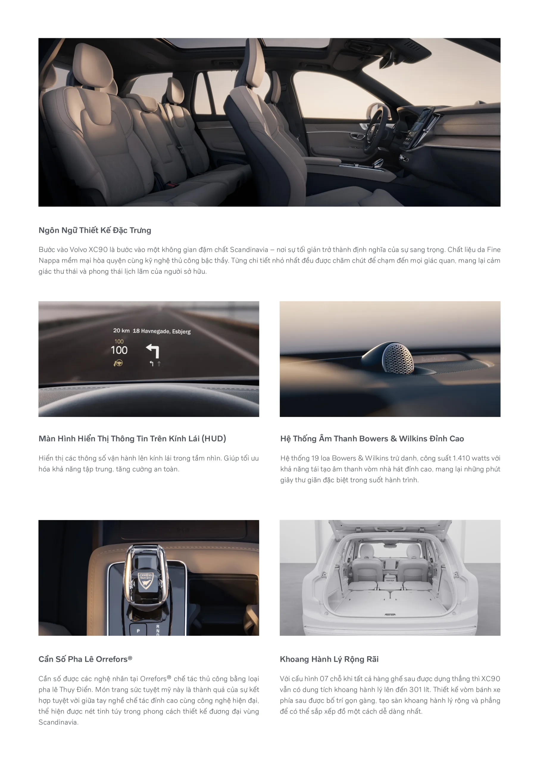 Hệ thống loa Bowers & Wilkins cao cấp được tinh chỉnh chính xác trong xe Volvo sẽ mang đến trải nghiệm âm thanh sống động, tràn ngập khắp không gian . Khoang hành lý trên VOLVO XC 90 cũng vô cùng rộng rãi với dung tích tiêu chuẩn 447 lít khi sử dụng cả 3 hàng ghế, tối đa khi gập hàng ghế thứ 2 sẽ tăng lên 2427 lít. Cốp xe được trang bị điện, mở cốp rảnh tay và chống kẹt